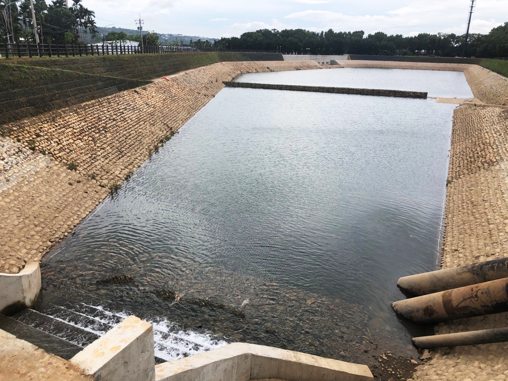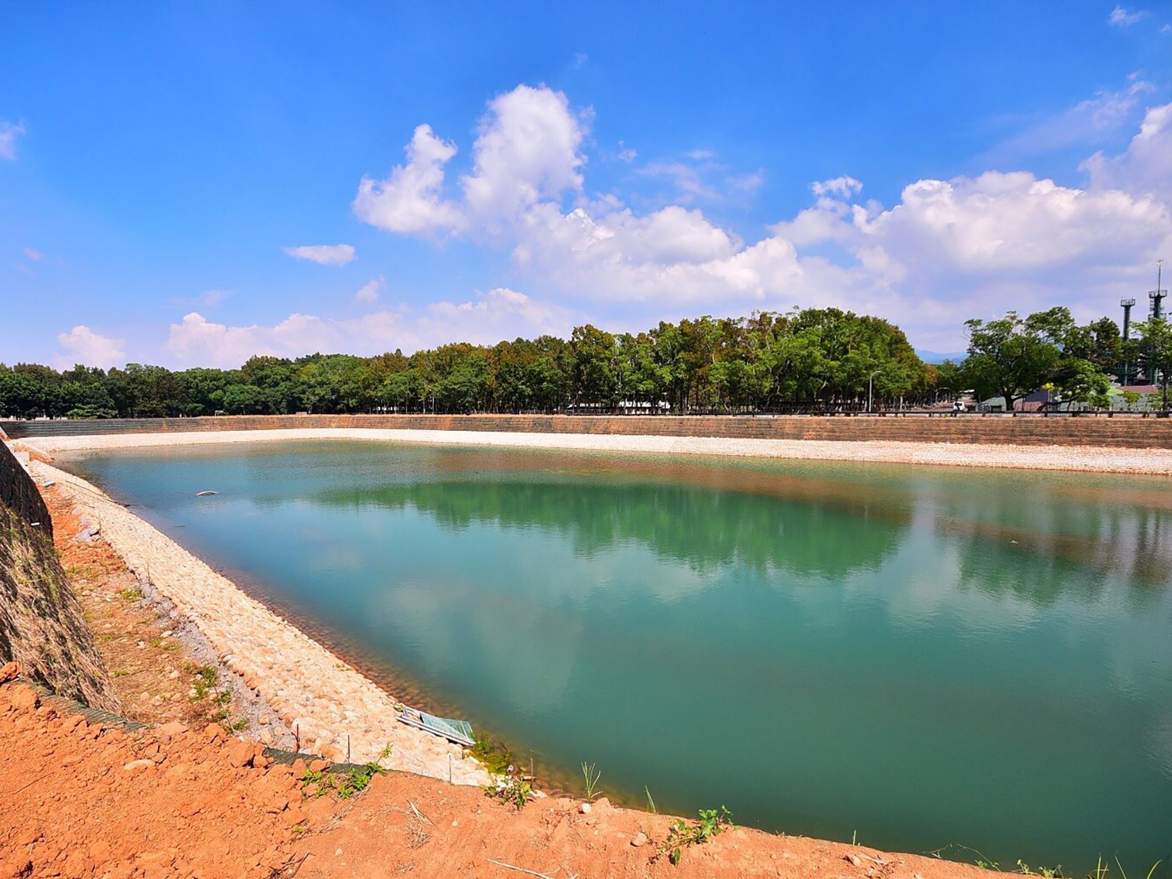 The Jiuqu ditch drainage in the new community flows into the Cinnacle Creek near the upstream of the Fansheling Bridge, and the catchment area suffers heavy rains and floods every time, resulting in heavy losses. According to the planning results of the "Flood Mitigation Plan for the Surrounding Xingzhong Street in Xinshe District" (Taichung City Government, Republic of China 105), in order to effectively improve the flooding problem, priority is given to the "Jiuqugou Detention Pond Project in the New Community", which effectively reduces the overall flood loss in the region and improves the quality of life of the people through the concept of block-based water control. Jiuqugou Detention Pond belongs to the trough type detention pond, and the related flood control facilities include inflow workers, inflow box culverts, detention ponds (divided into upper and lower two pools), overflow weirs, outflow workers, outflow box culverts, etc., with a total detention volume of 94,800 cubic meters, and 25,000 cubic meters of water can be stored at ordinary times, which is used as irrigation water.