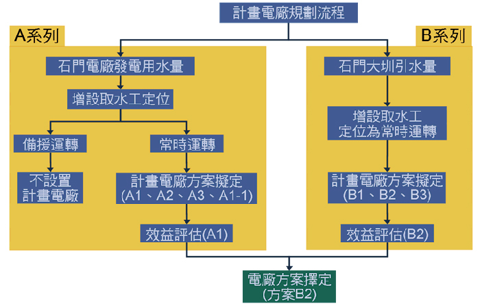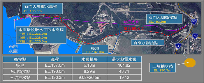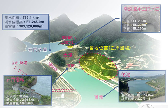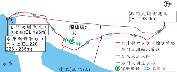 In order to divert raw water with low turbidity to supply water for people's livelihood in Taoyuan area when the raw water of Shimen Reservoir is turbid, the Water Resources Bureau of the North District of the Water Resources Department of the Ministry of Economic Affairs plans to add water intake workers to divert clearer raw water from the upper layer of the reservoir, so that the water supply in Taoyuan area will be worry-free during the flood period. As the additional water intake facilities have considerable head and discharge capacity, and have the potential for hydropower generation, this project was established to conduct power generation studies.