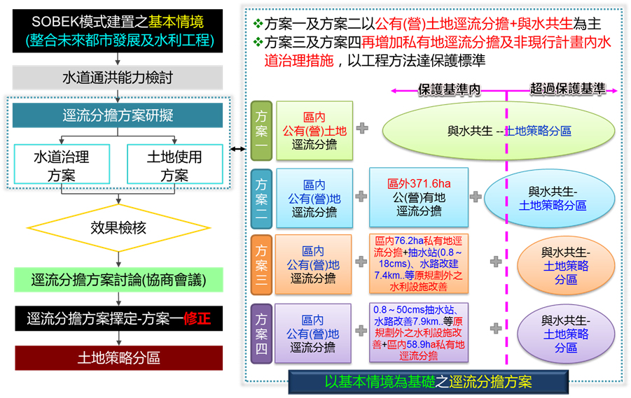 Before the completion of the revision of the special chapter on runoff sharing and outflow control in the Water Conservancy Law, the Water Resources Department of the Ministry of Economic Affairs commissioned five counties and cities to run trial operation plans in order to formulate a strategy for the sharing and control of runoff as a reference for policy promotion. The Tainan Municipal Government has chosen the catchment area of the Yanshui Creek drainage system within the boundaries of the Annan Administrative Region (with an area of about 65 km2) as the pilot area to handle the planning of diversion sharing, the planning of outflow control measures, the development of the trial operation mechanism and the negotiation of operations.