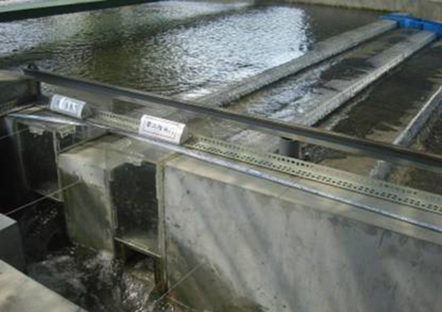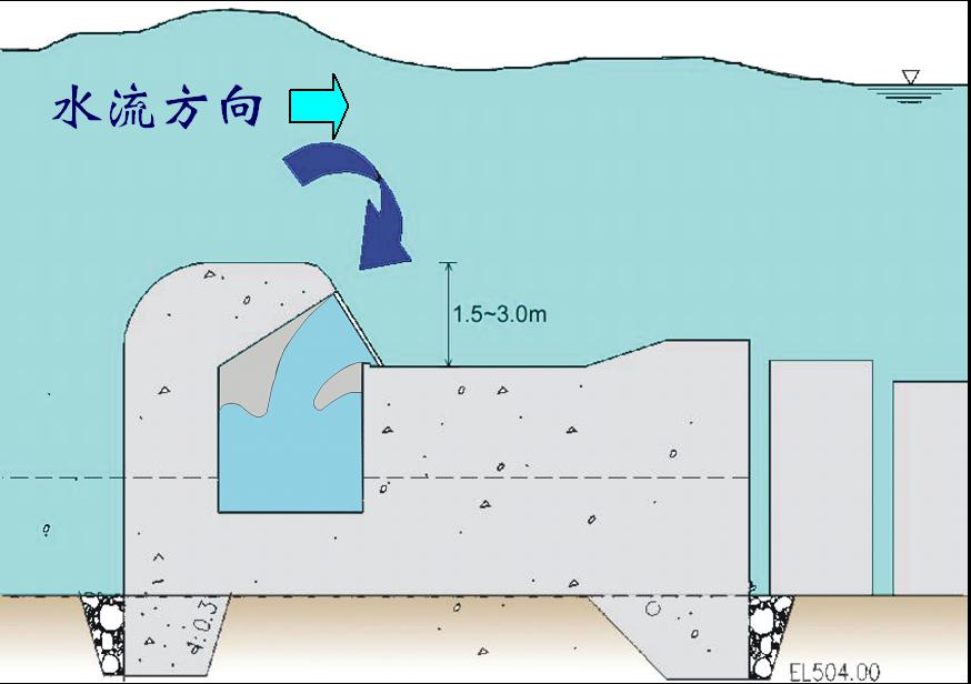 The weir design of the barrage is low, the weir type adopts a three-stage drop type, each stage drops 2 meters, and the weir surface design focuses on the wear and tear caused by the rolling of the riverbed material, and the wear-resistant concrete (strength 630 kg/cm2) is used in this plan. The total width of the fixed weir is 200 meters, from the left bank to the right bank, respectively: 74 meters for the left bank water intake section, 8 meters for the fish passage, 1 meter partition wall at each end of the fish passage, and 116 meters for the right bank water intake section. The water intake method adopts the pipe grid to take water (rear water intake), the design of the pipe grid angle, gap width and other pipe grid types and arrangements are calculated by hydraulic theory, and the hydraulic model test is handled by the water conservancy planning laboratory, and the design analysis is fed back by the model test data, and the barrage will be the largest pipe grid water intake project in China after completion.