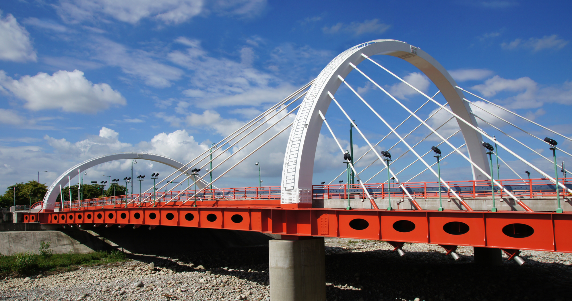 Bridge No. 1 Form: Cable-stayed bridge; Features: The traditional bridge pillars are replaced by steel arches, and radial slings are configured along the arch circle to create the image of a tunnel, so that people from other counties and cities can enter the pit with the feeling of 'another village'.