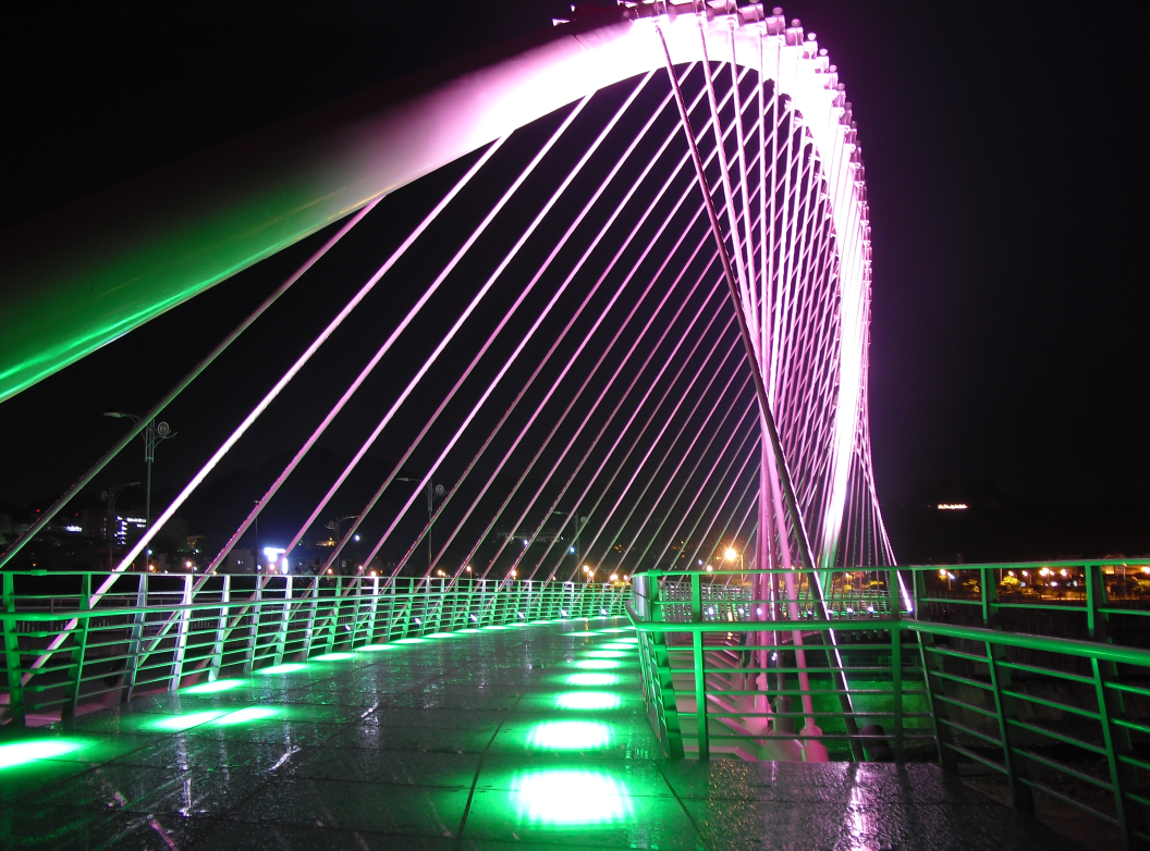 No. 2 bridge form: box steel girder main bridge + single-arch steel cable pedestrian bridge; Features: The arch ribs are round steel pipes, with a double cable surface of the sling suspension bridge deck version, and the side-view slings are intertwined like bamboo baskets, showing a dynamic beauty as a whole.