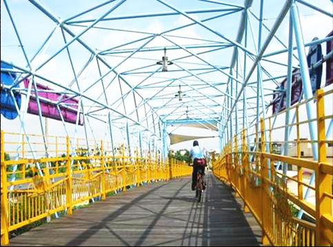 Steel truss bridge bicycle bridge, 125m long. The development concept of using trusses takes space transformation as the starting point, and proposes creative space transformation and space segmentation, which can make people deeply experience the feeling of traveling through time and space, and shape the special culture and landmarks, landscape characteristics and features of the region, and give the space a new life form. Provide a safe and comfortable bicycle riding space and promote the development of the local tourism industry.