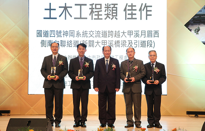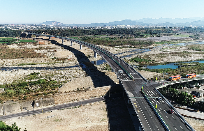 The bridge is 869 meters long, spanning Dajia Creek, the main span is increased to 130 meters, and only 7 piers fall in the water area, which greatly improves the effective water section of the riverbed and reduces the threat of local erosion of the bridge piers. The alignment of the bridge adopts a circular curve with a radius of 1,000 meters, and with a fixed longitudinal slope, in addition to greatly improving driving comfort and safety, it has achieved remarkable results in precision control and efficiency improvement in the construction stage, and this case won the honor of the 18th "Public Works Gold Award" of the Public Works Commission of the Executive Yuan in 2018.