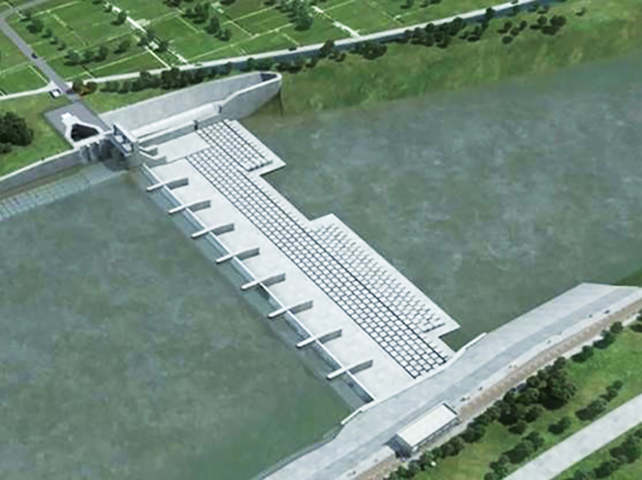 Dumping movable weir, left bank sand drainage channel and fish passage, upstream and downstream protection workers, weir surface protection workers, water inlets, diversion roads, bank revetments, liaison bridges, operation rooms, Zhongzhuang adjustment pool engineering plan mechanical and electrical engineering.
